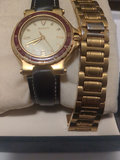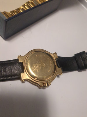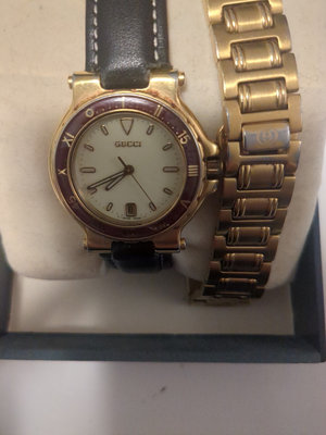 Watch in a leather strap also includes original gold tone band Battery was changed 6 months ago and recently died was running great, needs new battery