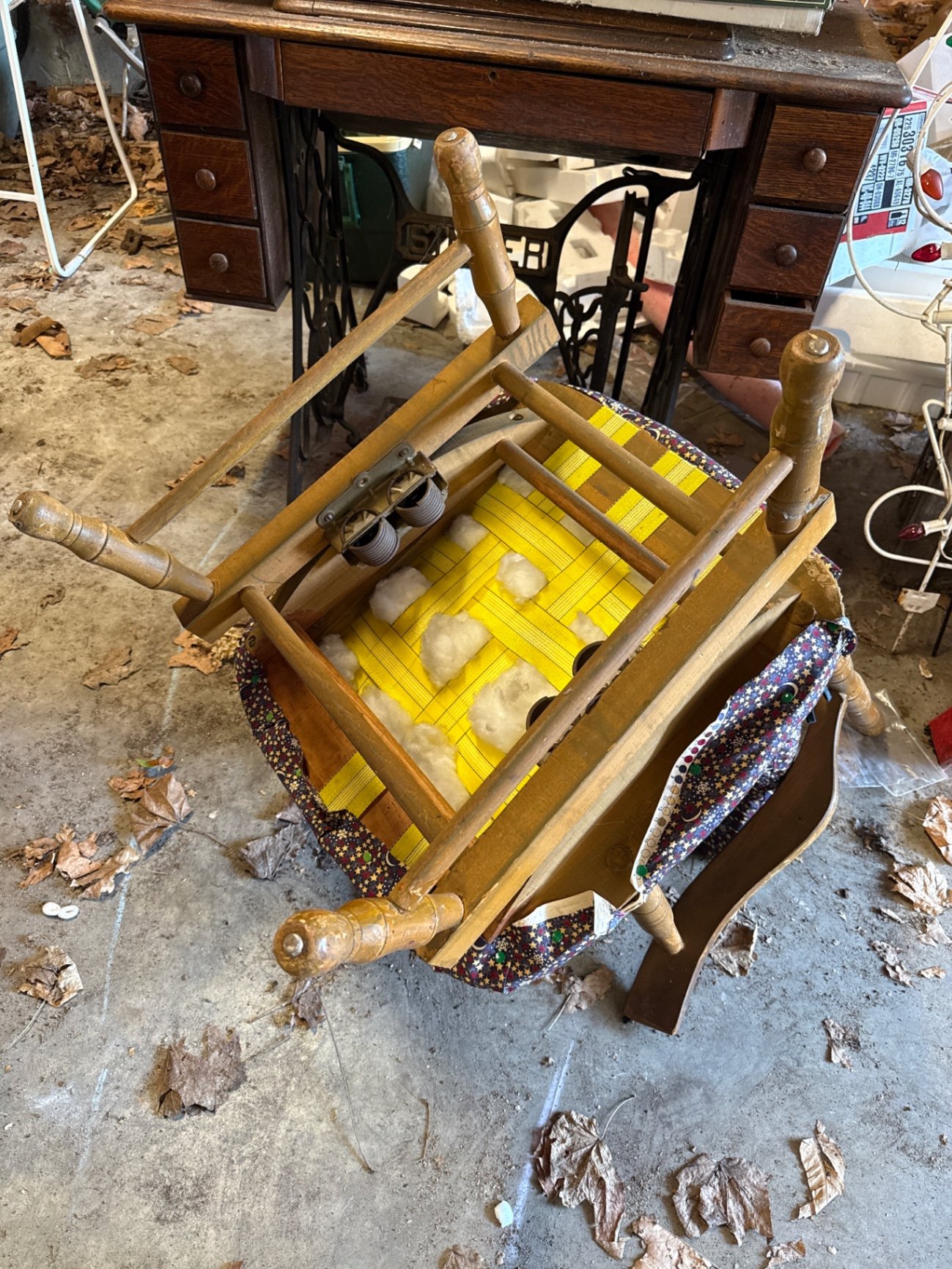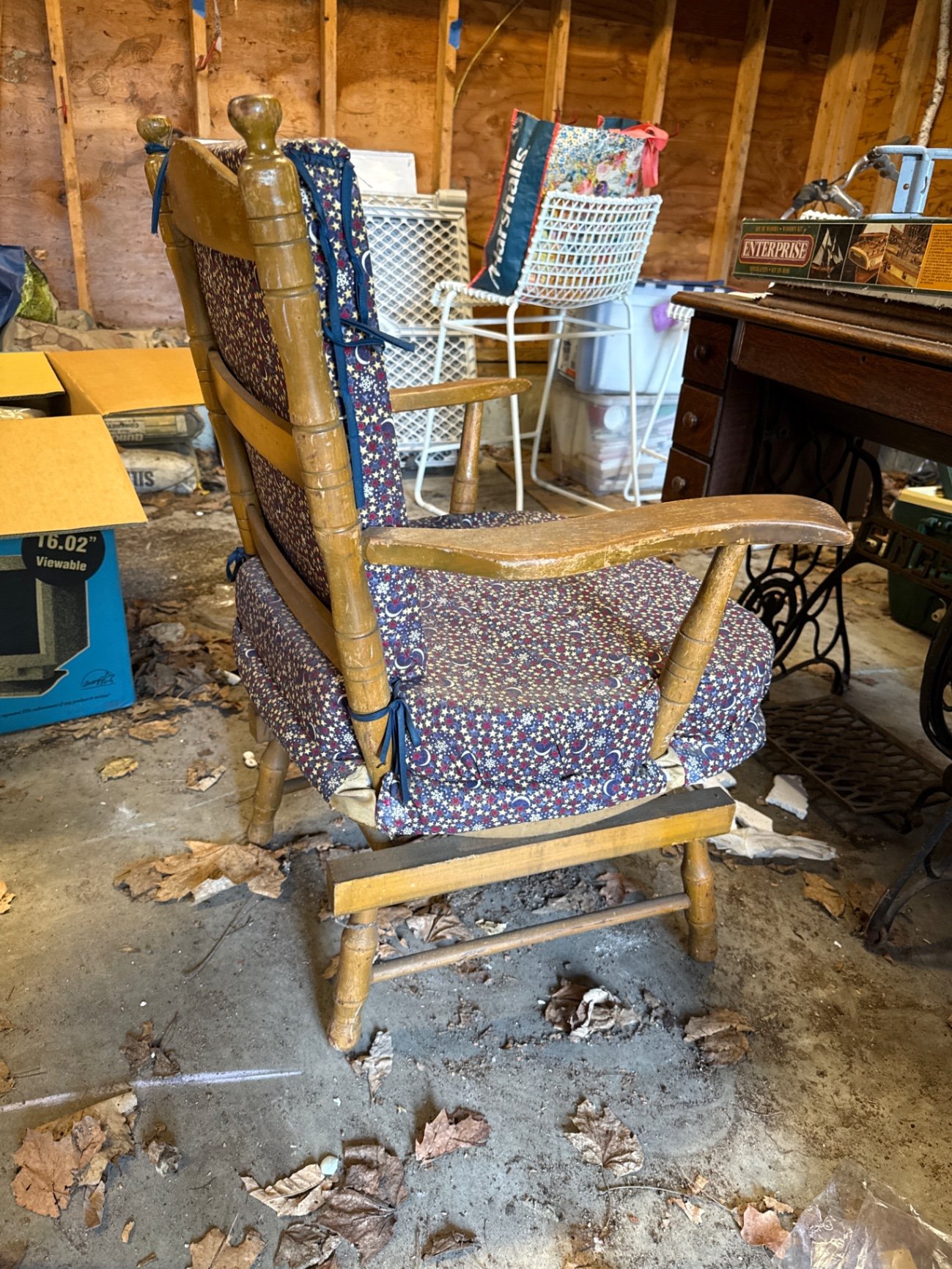 A vintage wooden armchair with a curved back, turned posts, and padded seat and back cushions covered in a dark fabric with a small star and crescent pattern. The cushions are tied to the chair and an upholstery tag is visible on the underside describing cushion filling. Seat tilts back and forth on spring mechanism. Needs cleaning. Located in garage.