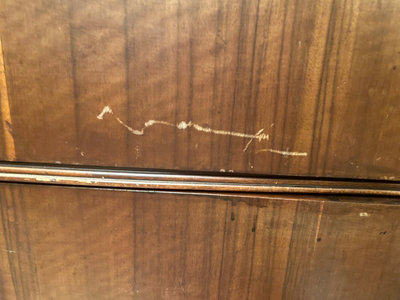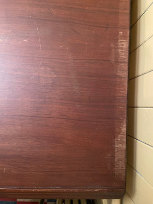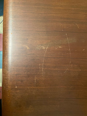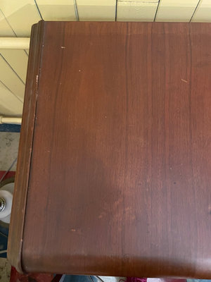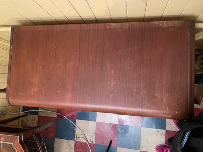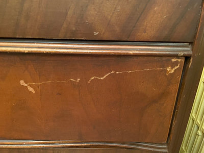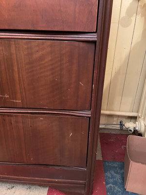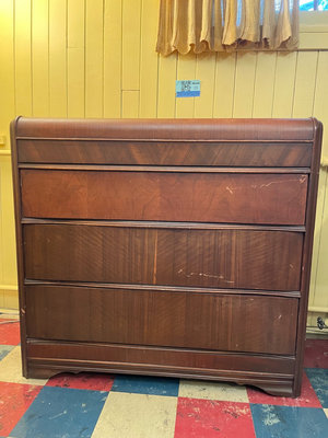 A Canadian-made vintage dark brown dresser with 3 drawers showing scratches and wear. 38 inches wide by 18 inches deep by 34 inches high