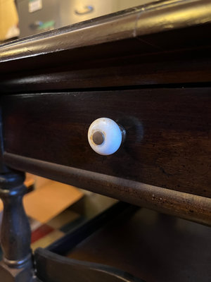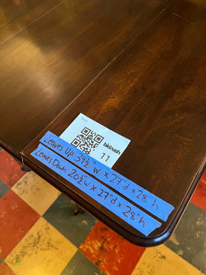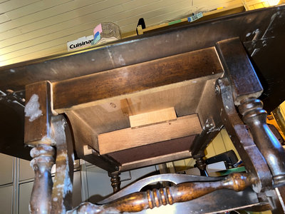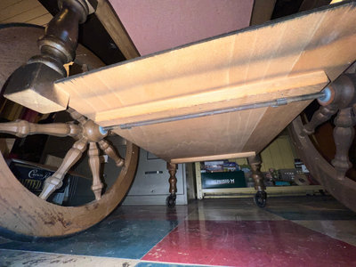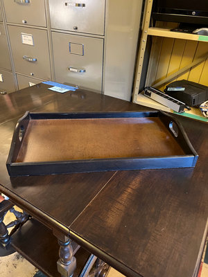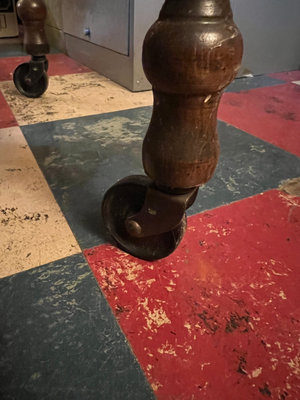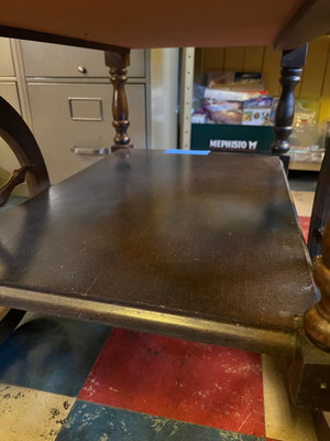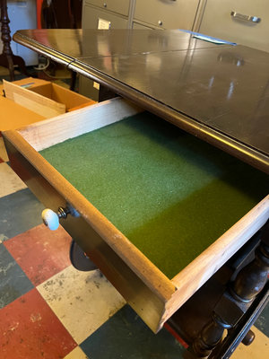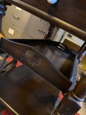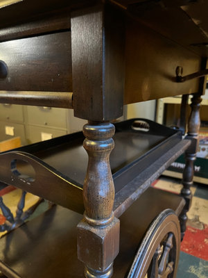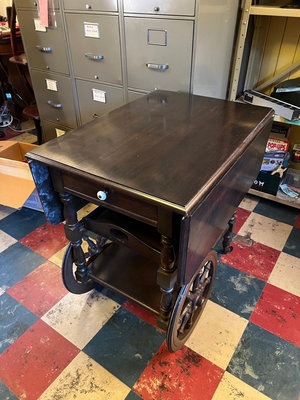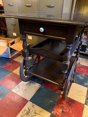 A dark wood rolling cart, two large wheel assemblies, a front drawer with a white ceramic knob, an open middle shelf, and a lower removable tray. The drawer interior is lined with green felt. **BRING HELP TO MOVE FROM BASEMENT