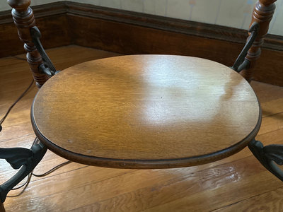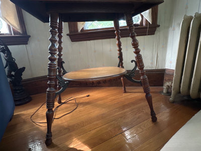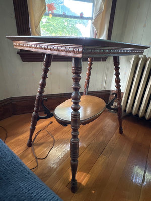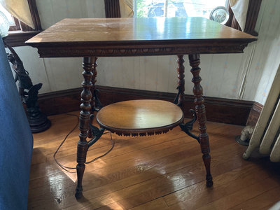 Two-tier wooden table with a square top and an ornate carved edge, four turned legs, and a circular lower shelf connected by decorative metal brackets; dimensions about 28 x 20 x 29.5 inches.