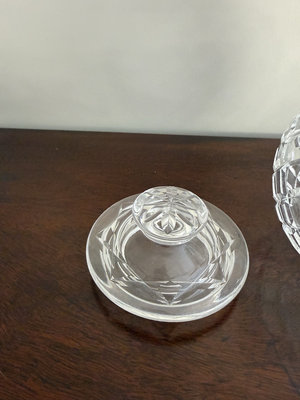 A clear Waterford crystal covered jar with a diamond-cut pattern and a matching lid; dimensions approximately 6 inches wide by 8 inches high.
