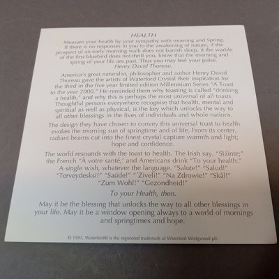Waterford Crystal, The Millennium Collection: A Toast to the Year 2000, toasting flutes with the "Health" pattern, produced in Italy, with original box and papers, 9.25h. 1 piece.