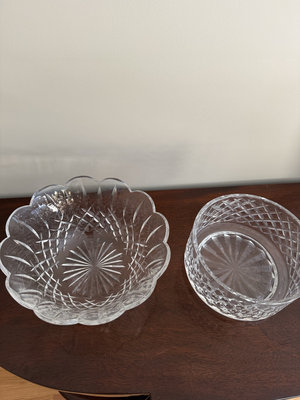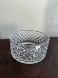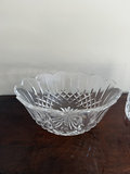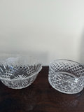Two Waterford crystal glass bowls with intricate cut patterns; 7 and 8” one features a scalloped edge with a starburst design and the other has a diamond-cut lattice pattern.