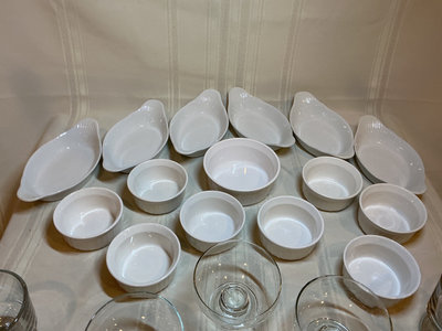 A collection of white ceramic dishes in multiple sizes and shapes (including leaf-shaped dishes by Everything Kitchen and ramekins by Corningware) accompanied by clear glass dessert bowls and goblets.