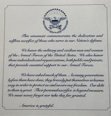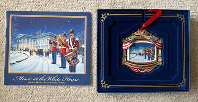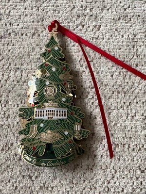 2003 commemorative ornament from the dept of defense , honoring those who serve our nation’s defense, 2010 ornament honors 25th president William McKinley and is titled Army Navy Reception 1900. The 2015 ornament honors Calvin Coolidge, with the National Christmas tree, brass plated with 24k gold . The 2016 ornament honors the 31st president Herbert Hoover, called “A Fire in the West Wing” Finally the 2018 ornament honoring Harry Truman, illustrating 3 changes , the Presidential seal, and 2 construction projects to the White House itself.