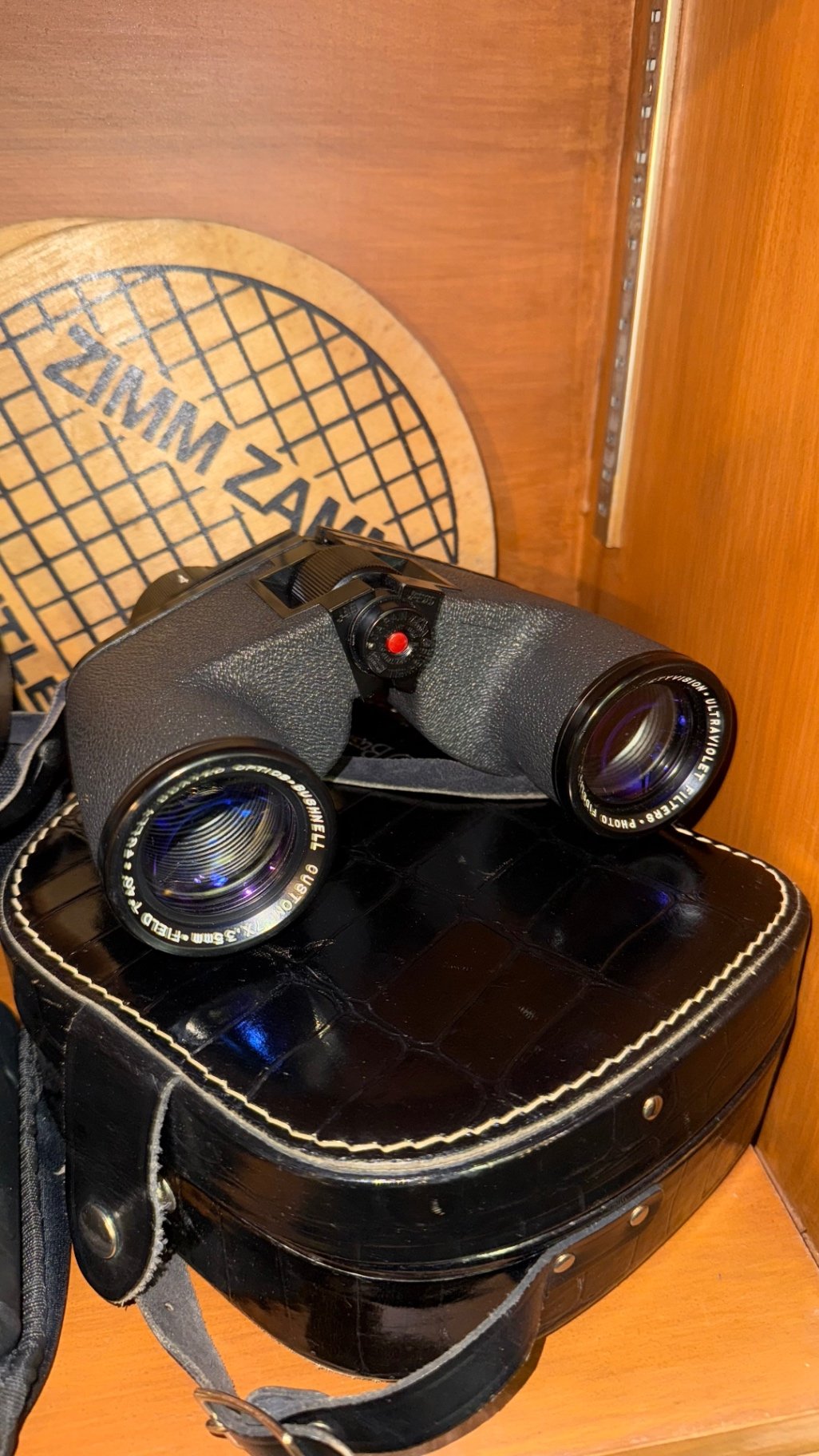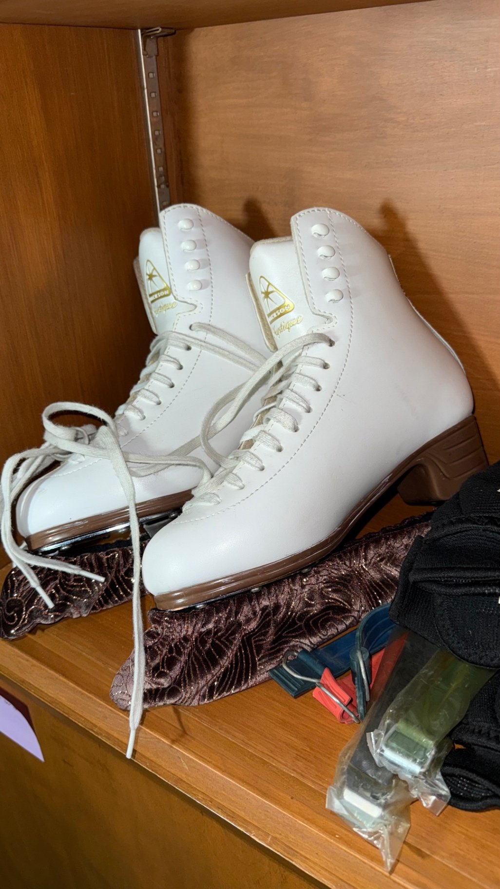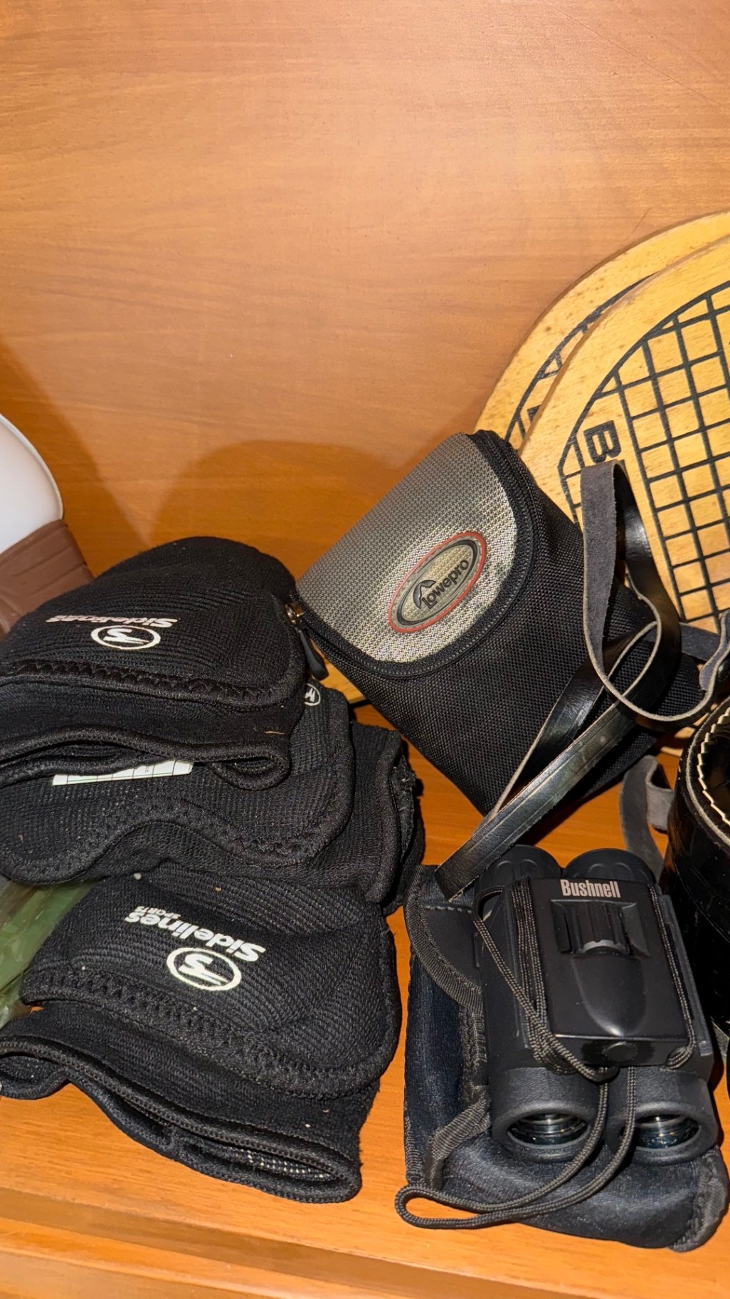 A collection of sporting equipment including white ice skates size 6.5, a pair of binoculars with a black carrying case, protective gloves/pads, and small accessory pouches.