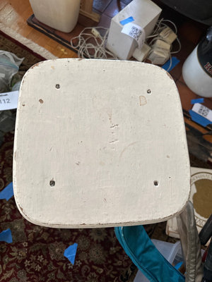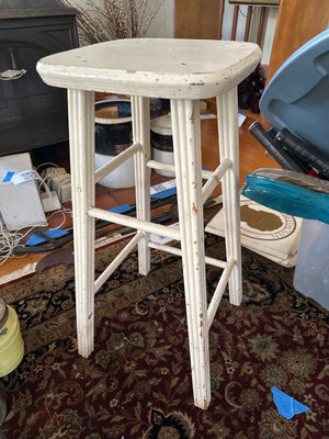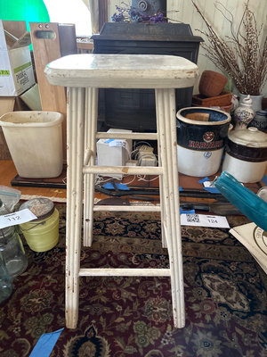 A white painted wooden stool. Note, wear and missing cross bar.