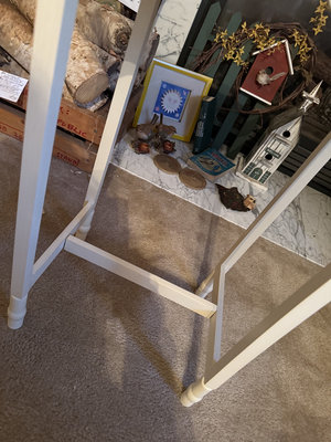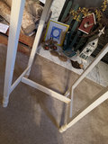 A small white wooden nightstand with one centered drawer and a round knob, supported by four straight legs connected by a lower crossbar and featuring decorative curved side rails. 14x30