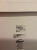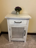 A light gray, whitewashed nightstand featuring a single shallow drawer with a black metal pull, and a lower cabinet door with a woven cane panel and a black handle. A small decorative vase with purple flowers included. It’s lightweight, feels like mostly wood, possibly some veneer and press board.