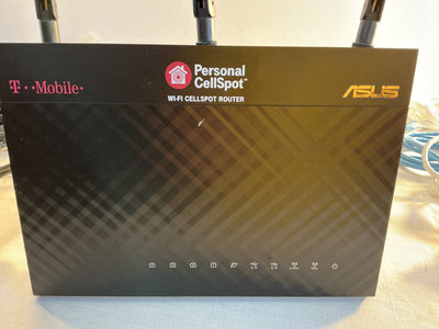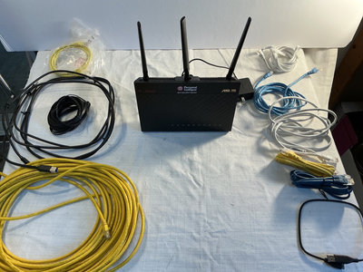 An ASUS Personal CellSpot Wi-Fi router with two external antennas and a variety of Ethernet and USB cables.
