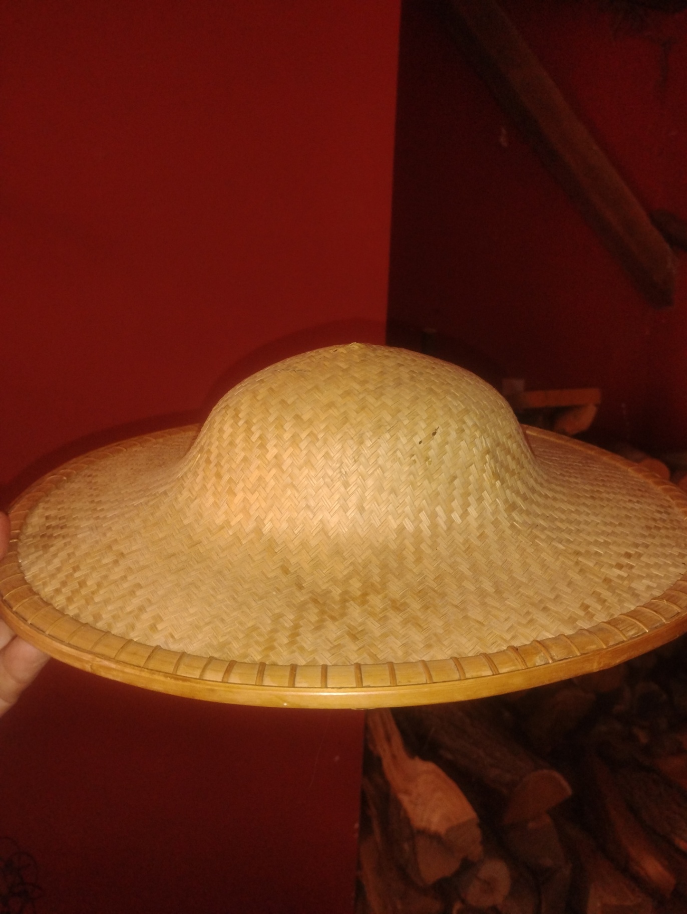 A woven straw hat with a rounded crown and wide brim, made from interlaced natural fibers.