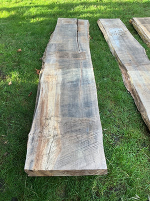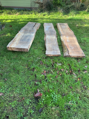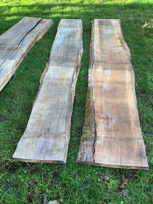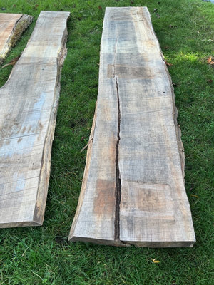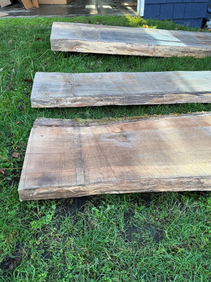 Three Maple rough-cut wood slabs with natural edges and some cracks: Each slab is just shy of 9 feet long and roughly 18-22 inches wide: