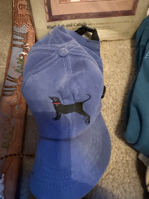 Assorted wildlife and outdoor-themed items including hats, graphic shirts, a printed hunting scarf, belts, a small leather pouch and jewelry, and cross-stitch kits featuring a Black Lab and other wildlife motifs.