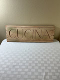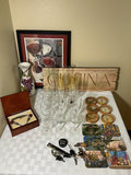 A collection of wine and kitchen decor items including decorative coasters (square floral and round butterfly designs), a corkscrew wine accessory set in a wooden box, assorted wine and champagne glasses, a grape-pattern ceramic vase, a carved 'CUCINA' sign 24 inches wide and 8 inches tall and a framed wine-themed still-life 16 inches wide and 19 tall.