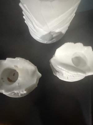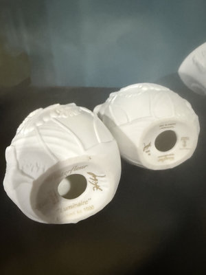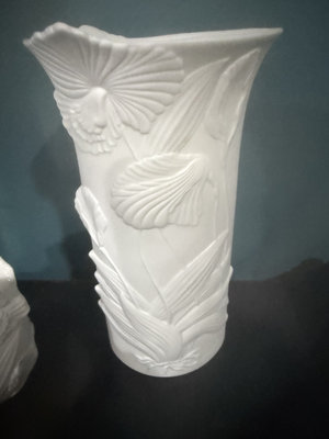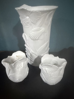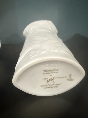 A white ceramic vase accompanied by two matching candle holders, all featuring a raised botanical pattern. The pieces are marked with the Winterflower Collection branding and a 'Fresh Flower Vase' designation, with a limited production note (limited to 2500).