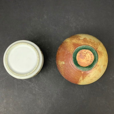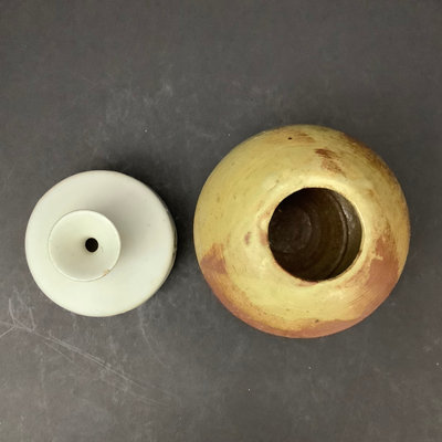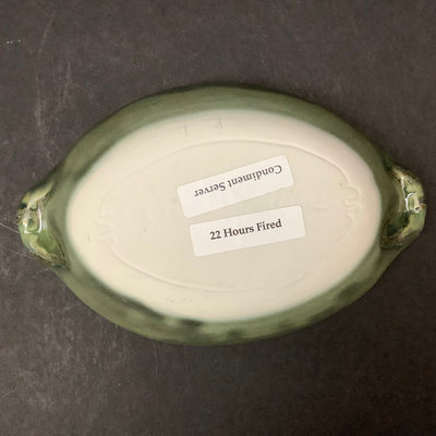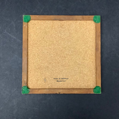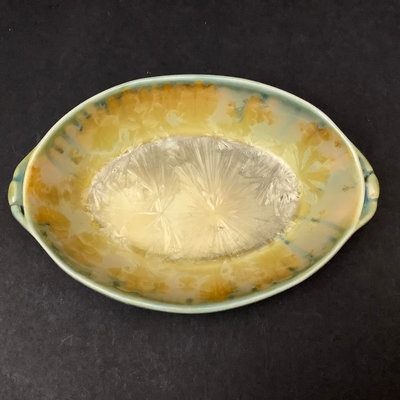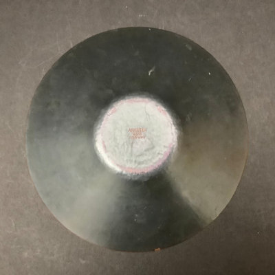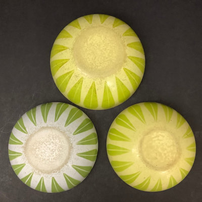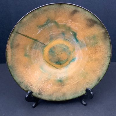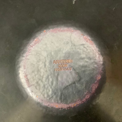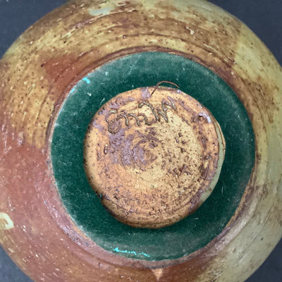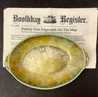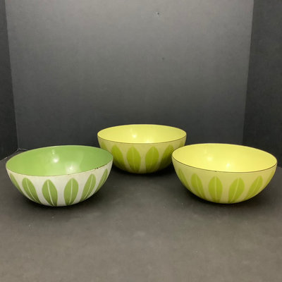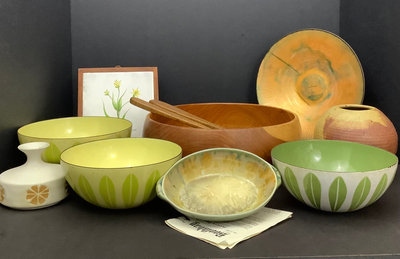 Large Nahra wood salad bowl with serving utensils, 12d x 3.5h. Well-loved Cathrineholm enamelware lotus bowls, 2 smaller 7d x 3h, larger 8d x 3.5h, made in Norway. Arnesen Soon Norway enamel on metal dish, 9.5d. Brown and yellow bowl vase, signature on bottom, 5.5h. White w/yellow design bud vase, no marks, 4h. Edgecomb Potters green and yellow dish with Kyoto Forrest glaze, made in Maine, 7x 4.75. Wood framed ceramic tile trivet with corked back, 6.75sq, made in Denmark. 10 pieces.