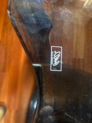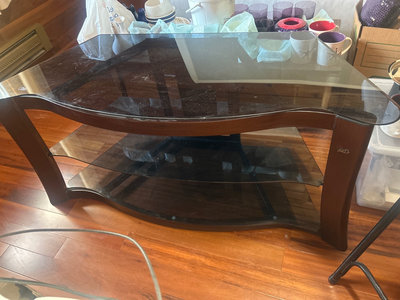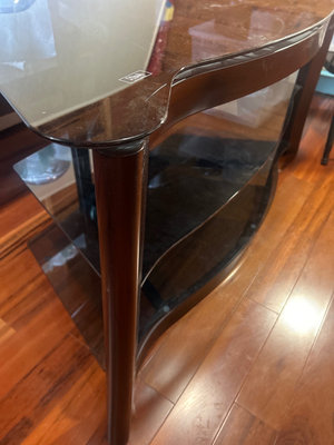 4’ wide in front, 20” deep and 22” high. Made by Olli Co, features a curved wood frame with three smoky tempered glass shelves. Perfect for the TV shown in the previous lot.