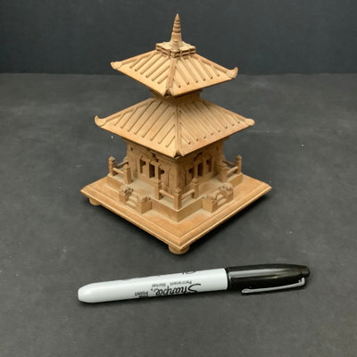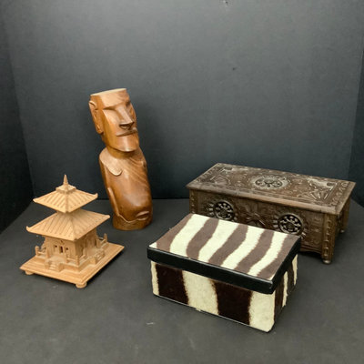 Easter Island carved wood figurine, 2dx10h. Carved Moroccan style hinged box with France stamp on bottom, 9.5x5x3.5. Zebra fur covered wood box, 6.5x4.5x3. Wooden pagoda, missing foot, 4.25sq x 6h. And more. 8 pieces.
