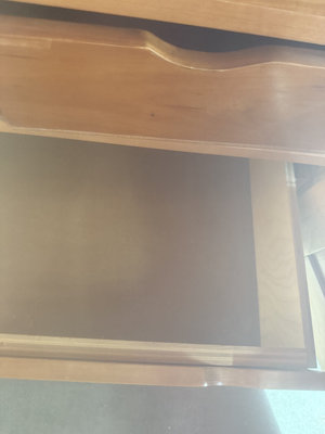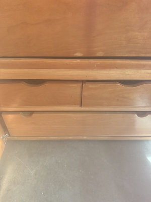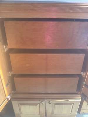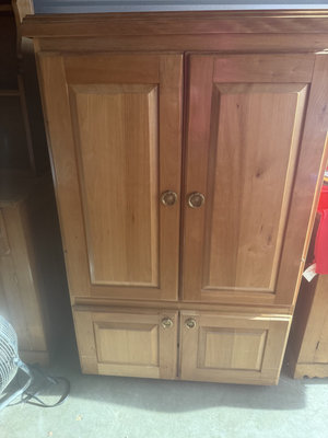 A wooden armoire cabinet with upper paneled doors and multiple lower drawers, featuring metal knobs and a medium-tone wood finish. The interior includes additional storage compartments. 33x25x51