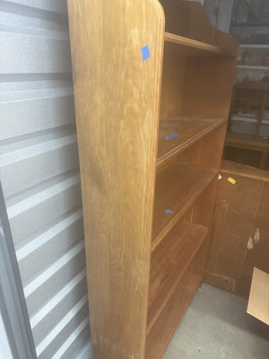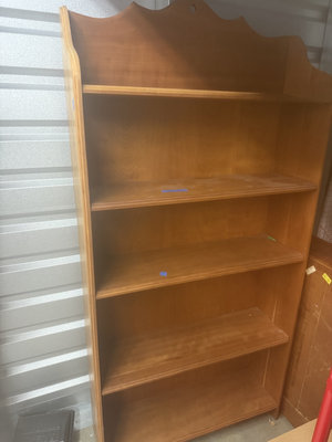 A tall wooden bookcase with multiple open shelves and a decorative crown-shaped top in a warm brown finish.
