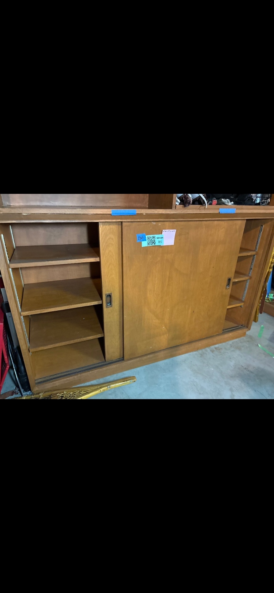 Wood-toned cabinet with sliding doors and interior shelves; dimensions labeled as 60W x 19D x 36H; shows edge veneer damage and surface wear. ** BRING HELP TO MOVE OUT OF BASEMENT