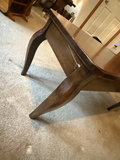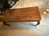 A dark wooden coffee table with a rectangular top and cabriole-style legs, one is broke, see pic 16x16x36