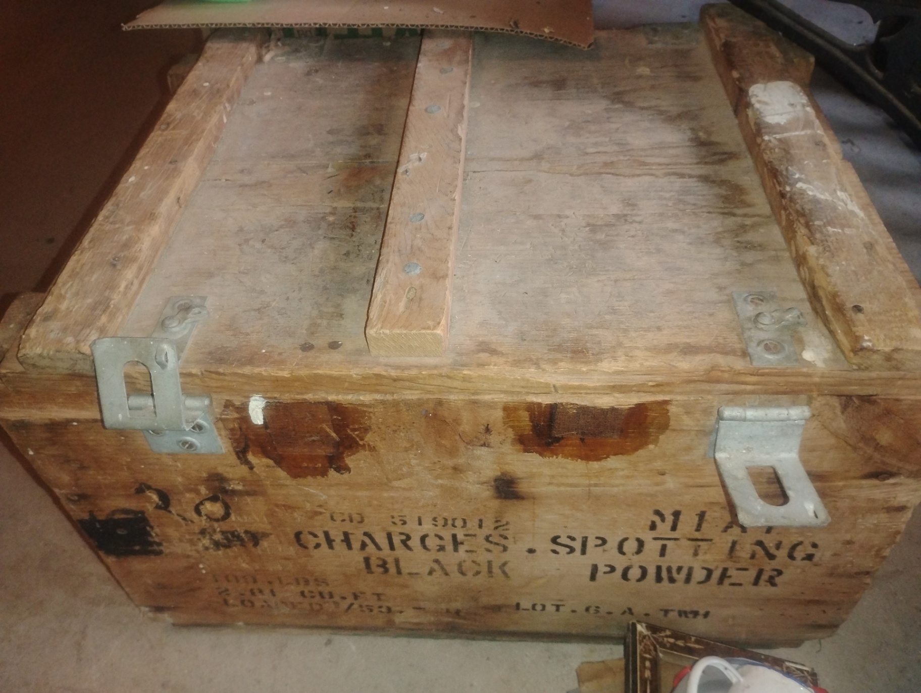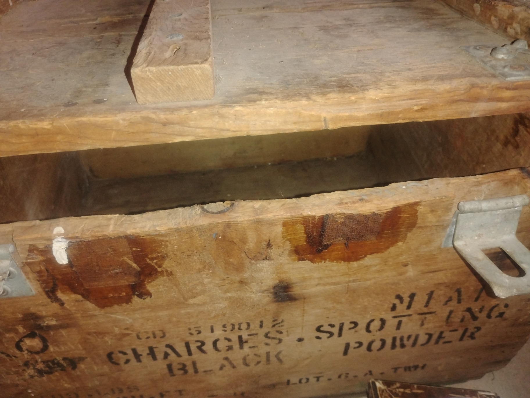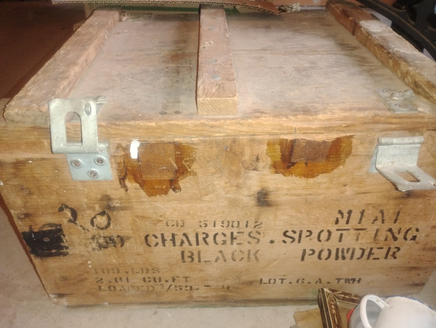 A weathered wooden crate with metal latches and handles, stamped with stenciled text reading 'CHARGES, SPOTTING BLACK POWDER' and other lot information.