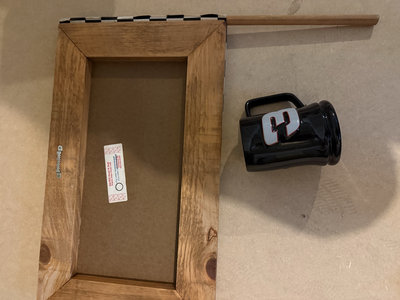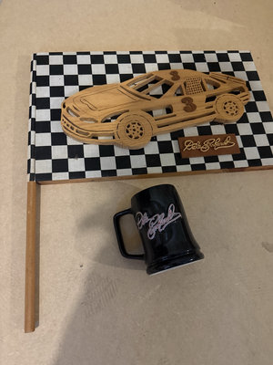 A wooden race car sculpture on a checkered display board, a black mug with script lettering, and a wooden picture frame with a small label marked 185.