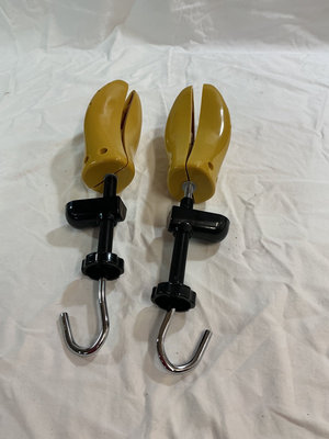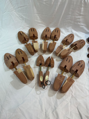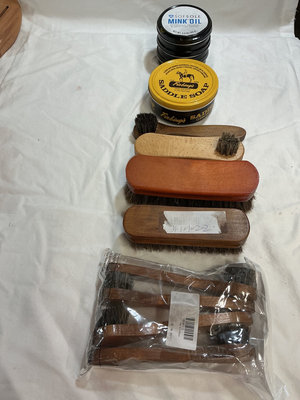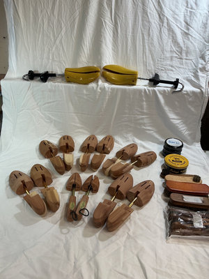 A collection of shoe care items including mink oil and saddle soap containers, several wooden shoe lasts in multiple sizes (some labeled LEFT/RIGHT), brushes, and related polishing tools and accessories in packaging.