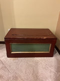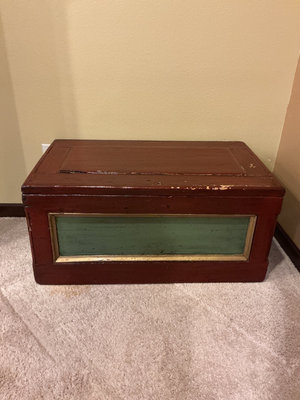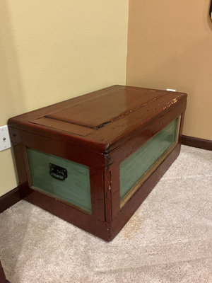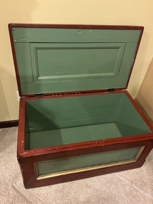 Rectangular wooden storage trunk painted red with, green and gold painted panels on the sides and a green interior, and metal hardware. The exterior has some chipping paint which could be intentional with the look of the piece. The measurements of the trunk are 37 inches wide by 21 inches deep and 18 inches tall.
