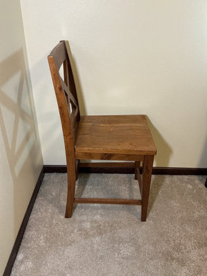 A wooden chair with an X-back design and a small marble-patterned tabletop on a black metal frame. Table is 23.5 wide, 36 long and 41 inches tall, chair is 43.5 inches tall.