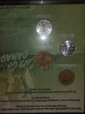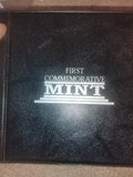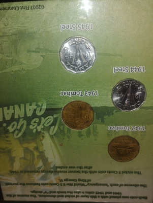 A presentation album containing a World War II Canadian five-cent coin collection (1942–1945) with tombac and steel coins, displayed on an informational page alongside a cover that reads 'FIRST COMMEMORATIVE MINT'.