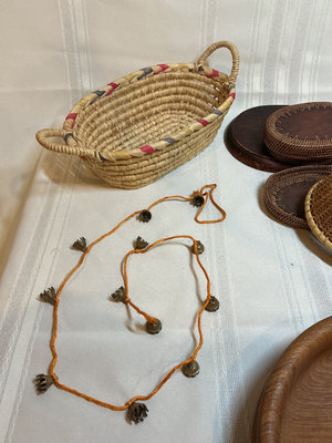A collection of woven baskets in various shapes and sizes, a teakwood wooden bowl by Selandia designs and more