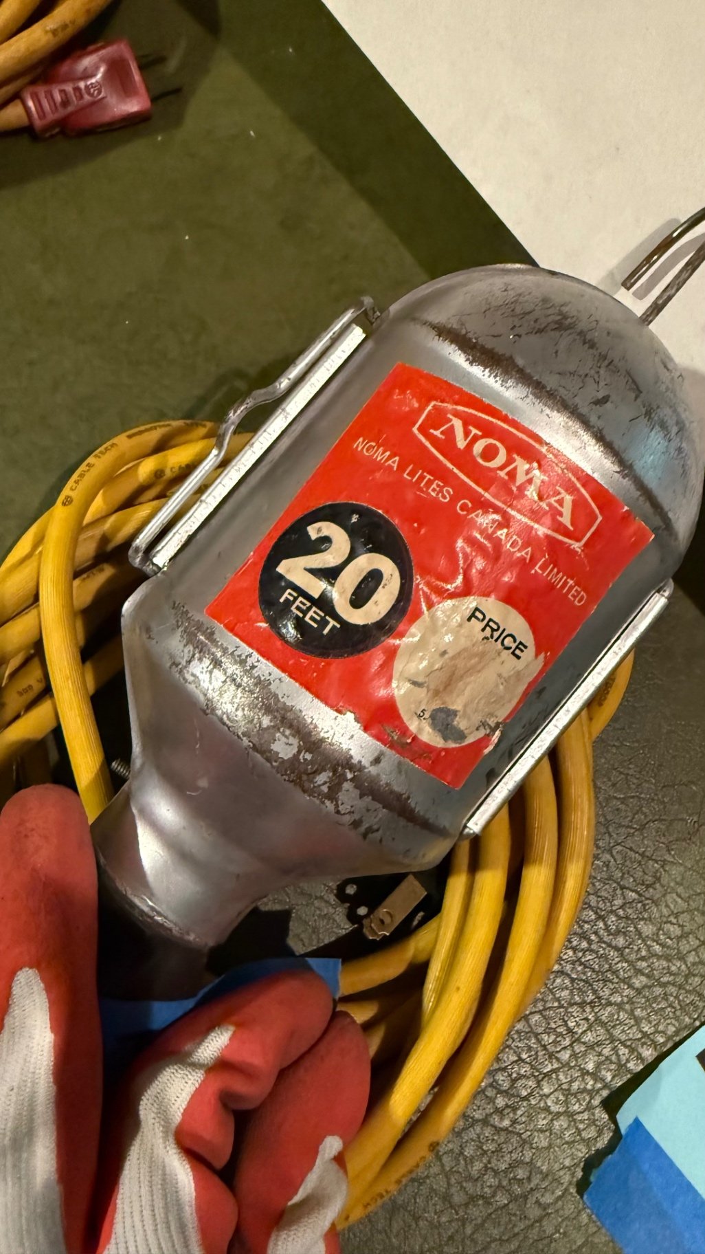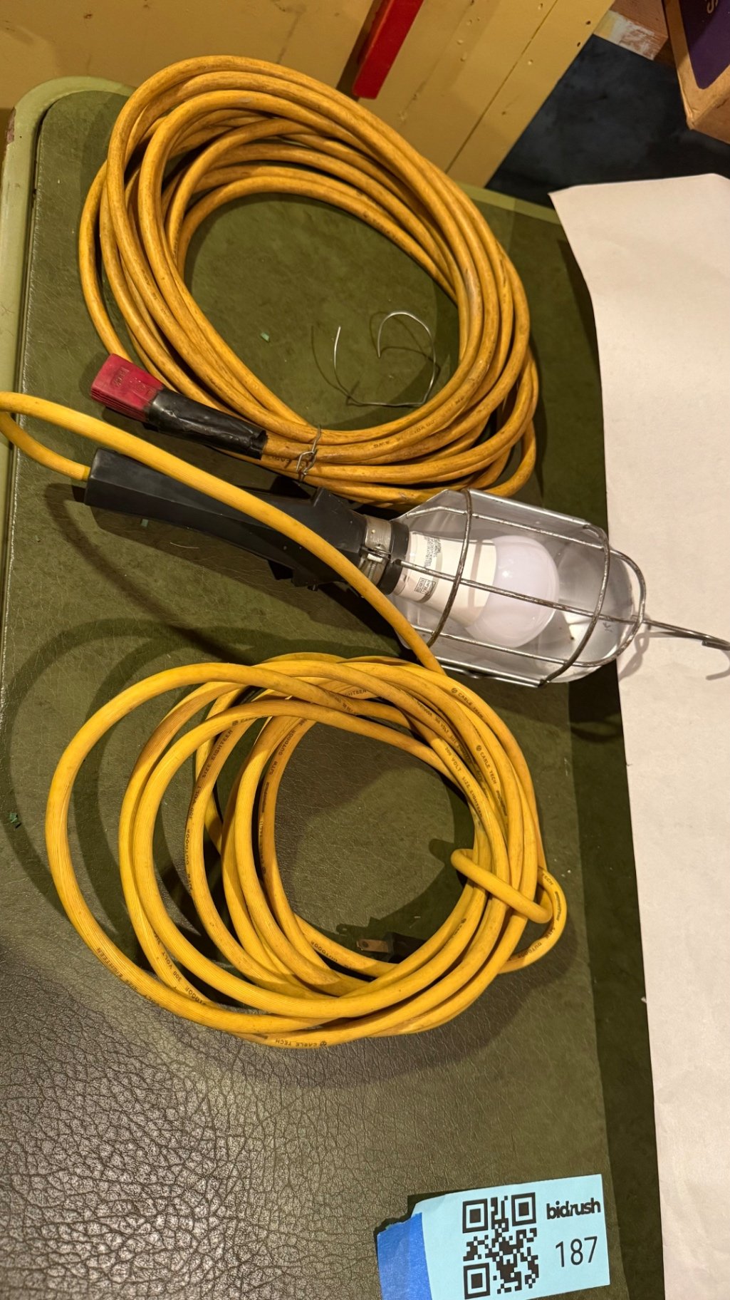 A pair of long yellow extension cords coiled around a portable metal work light with a protective cage. Working as per owner. ** BRING OWN PACKING MATERIALS