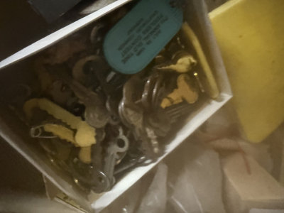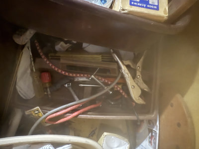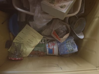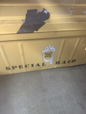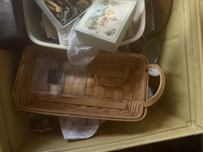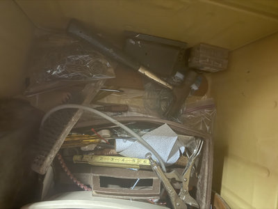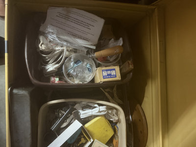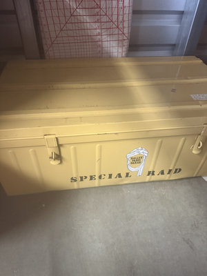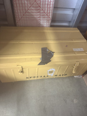 A yellow metal storage trunk 34x14x19 labeled SPECIAL RAID contains multiple containers and baskets filled with assorted hardware, tools, cords and wires, metal fasteners, small boxes, a measuring tape, a wooden basket, and miscellaneous small items.