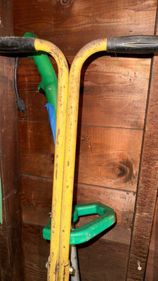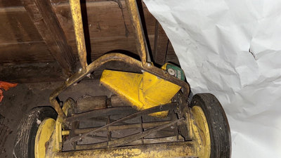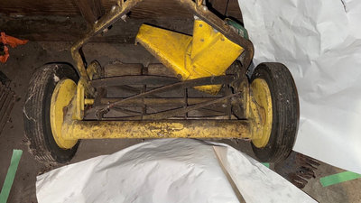 A yellow two-wheeled lawn tool featuring a drum of tines mounted on a frame, accompanied by green-handled garden tools and other implements. As is as found. **BRING OWN PACKING MATERIALS
