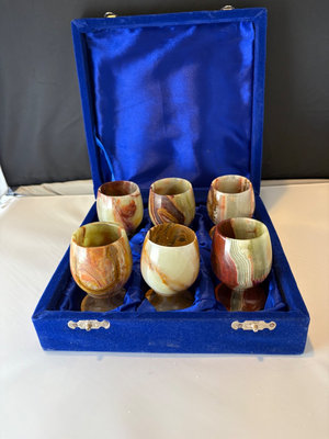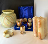 Beautiful onyx pieces , put a light inside and it glows …. Bookends, trinket/ ashtray, goblet set in box .