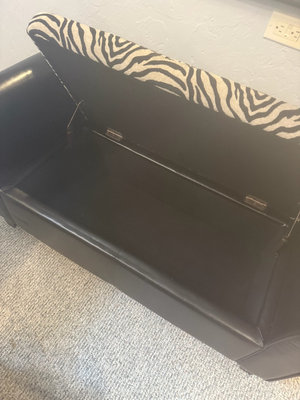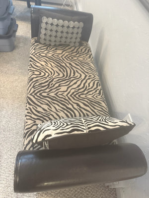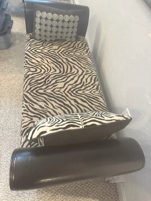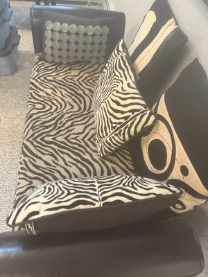 A black faux-leather sofa covered with zebra-pattern fabric and multiple decorative cushions in zebra print and geometric beige/black patterns. 46"