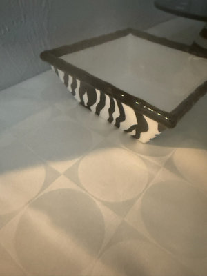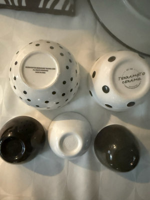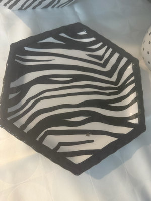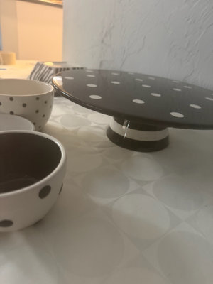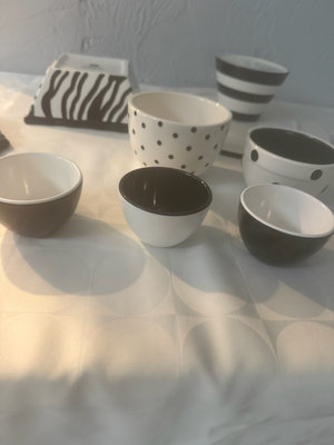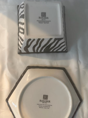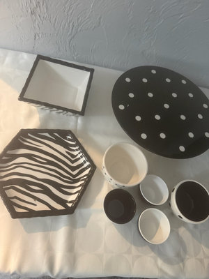 A collection of black and white ceramic kitchenware featuring zebra stripe patterns and polka dot motifs, including bowls of several sizes, cups, a hexagonal plate, a square dish, and a round cake stand from the Roscher & Co Zebra Black and White Collection.