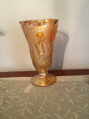 An amber- glass vase featuring vertical ribbing, raised floral motifs, a flared scalloped rim, and a pedestal foot. 9”