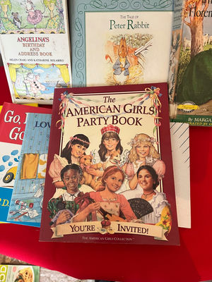 A mixed collection of children’s book. There's a Wocket in My Pocket, Go, Dog, Go!, Love You Forever, The Tale of Peter Rabbit, The Story of Florence Nightingale, Angelina's Birthday and Address Book, The American Girls Party Book: You're Invited!, The Guard Dog Story, and The Story of Florence Nightingale.