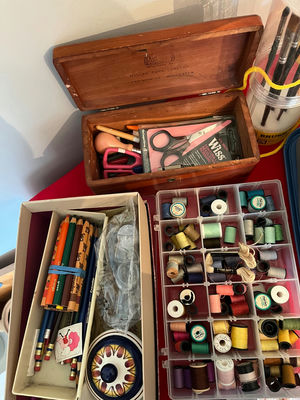 A collection of craft materials in multiple containers, including a plastic organizer with numerous colored sewing threads and embroidery floss, a wooden box with scissors and small tools, a tall cylindrical container with paintbrushes, a tub of acrylic paint jars with gold caps, and a tray of colored pencils and other miscellaneous hobby items.