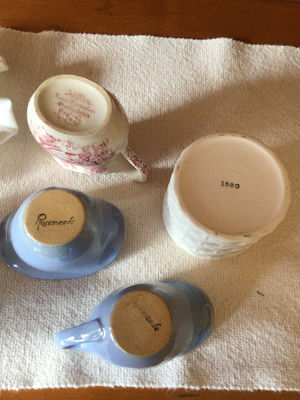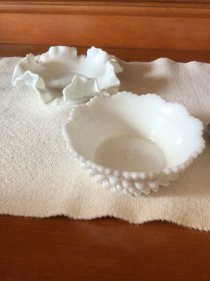 A collection of milk glass and Rosemeade items including two blue pouring creamer/pitcher vessels, two white ruffled-edge bowls, a pink patterned pitcher, and a white woven-lidded jar topped with fruit