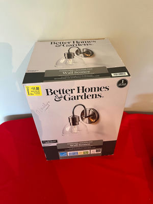 A collection of lighting fixtures and related hardware including two ceiling flush-mount lights (Chilton 15 in flush mount with frosted white glass shade and Hampton Bay 15 in flush mount), a Better Homes & Gardens wall sconce, a single-gang steel wall plate, and bulb-related packaging (Feit 4-pack bulbs and Lutron LED accessory).