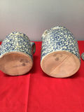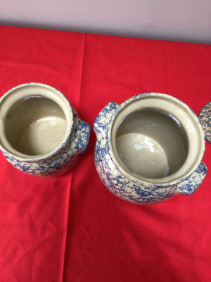 Set of two blue-and-white speckled glazed ceramic jars with lids; a larger and a smaller jar, each with a knob on the lid and small side handles.