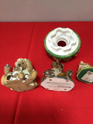 A collection of small decorative Boyd’s Bear figurines and ceramic pieces: teddy bear scenes, rabbit figures (including a pair on a bench), a flower-filled wreath-style candle holder, a cottage scene, a rabbit-themed dish, and other miniature figurines.