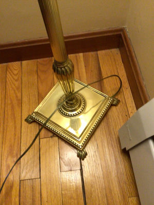 A brass floor lamp featuring a fluted column and a square ornamental base, topped with a beige fabric lampshade with dark trim.