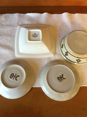Collection of small ceramic bowls marked including two blue-and-white patterned bowls and one with a brown floral interior, plus a square Wedgewood dish with a green border and a central figure.