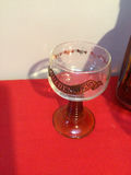 A glass decanter with a metallic-finished stopper, partially filled with amber liquid, accompanied by three matching stemmed glasses with pinkish bases.